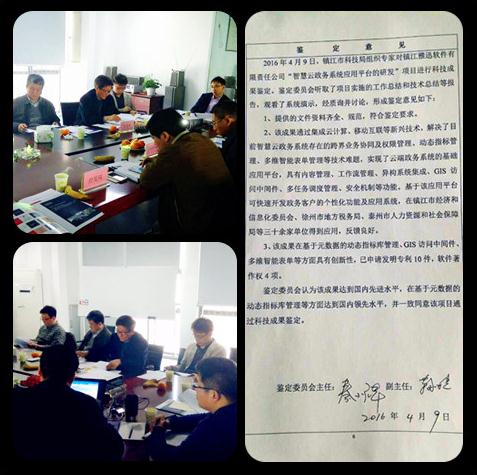 2016年4月9日,鎮(zhèn)江市科技局組織專家對我公司完成的“智慧云政務(wù)系統(tǒng)應(yīng)用平臺”項目進(jìn)行科技成果鑒定。鑒定委員會在審閱了相關(guān)文件資料,觀看了系統(tǒng)演示,經(jīng)質(zhì)疑討論后,對公司的項目成果給予高度肯定。